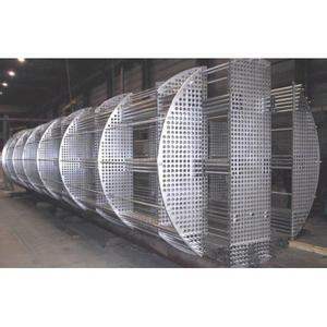 凝汽器主要由殼體[本體]+冷卻水室+導流管板+不銹鋼冷卻管+中間管板+擋汽板+凝汽器聚集器+化學補水器等組成的全焊接結(jié)構。殼體[本體]和水室焊成一個整體,殼體為鋼板焊接結(jié)構。在上殼體+水室及熱井均設計制造有人孔蓋,以便檢修+維修使用。筒體內(nèi)部不銹鋼冷卻管用脹管法或脹焊法,將不銹鋼冷卻管固定在端頭管板上,中間有隔板支承管子向上撓曲防止共振,管束布置采用HEL-6的設計技術,這是國際通用的凝汽器設計標準,用該技術設計的凝汽器為汽流向心式,弧向布置,三角形排列,其特點是汽阻小,過冷度小。管束中間有從進口直達熱水井之寬闊汽道,兩側(cè)管束用帶形排列,在帶形外側(cè),另為蒸汽沖刷之部分不銹鋼冷卻管。采用不銹鋼管,在汽道之間布置的擋汽板等防止蒸汽短路。